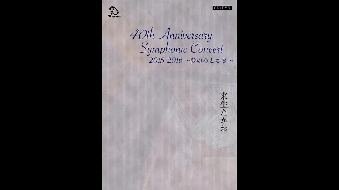 来生たかおデビュー40周年を記念して行われたフルオーケストラ公演を初の映像化!! 演奏は、東京フィルハーモニー交響楽団、指揮は、渡辺俊幸が花を添えた。 自身40年のキャリアの集大成とも言えるライブ映像をお楽しみください。 ♪シルエット・ロマンス ♪針の雨 ♪流れる・・・ ♪夢の途中 ♪いとしいあした ♪余白の街 ♪風と共に去りぬ ♪マイ・ラグジュアリー・ナイト ♪セカンド・ラブ ♪風のニュアンス ♪明日物語 ♪Goodbye Day ♪浅い夢